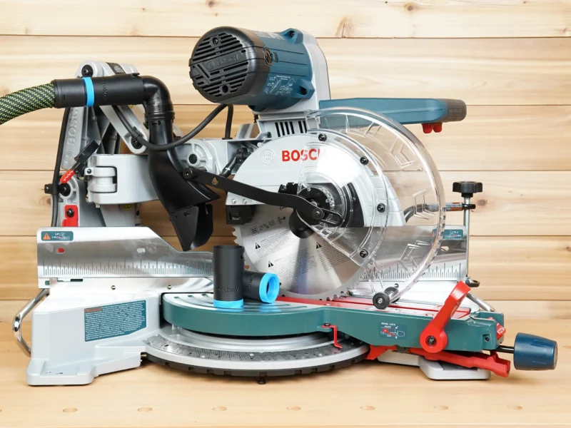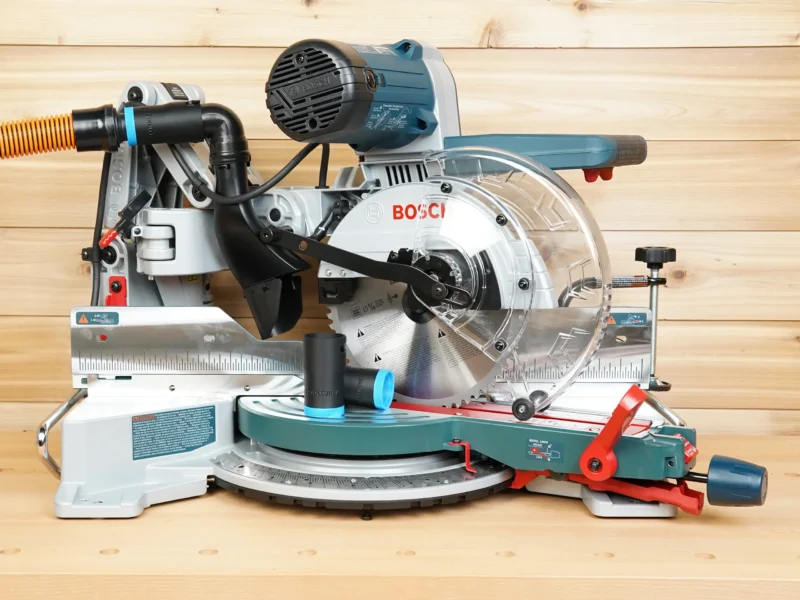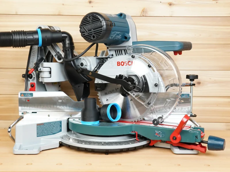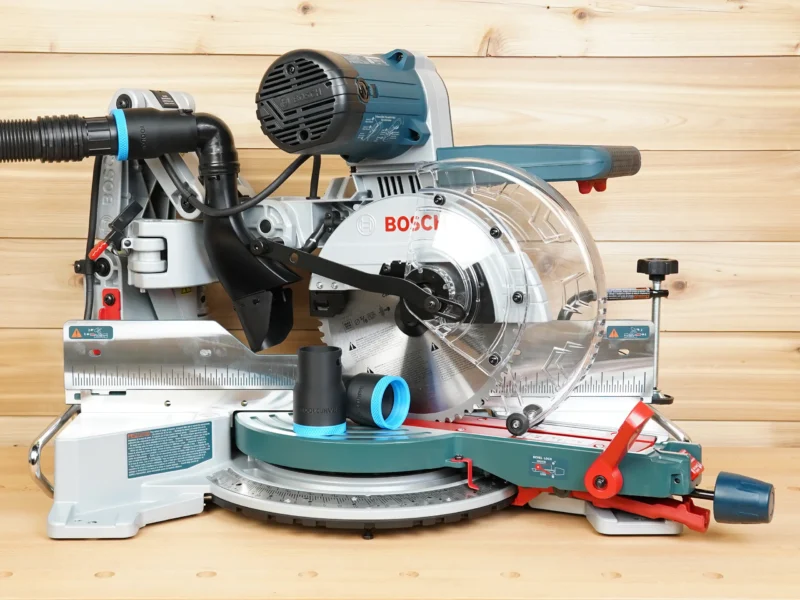 - Connect your shop vac & dust extractor hose to your Bosch glide 10″ compound miter saw