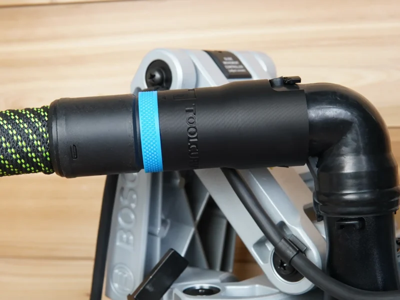 ToolCurve hose adapter for Bosch 10″ glide miter saws. This adapter allows you to use your dust extractor hose with your Bosch glide miter saw’s dust port.