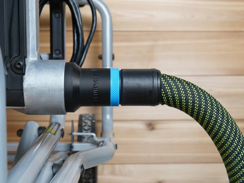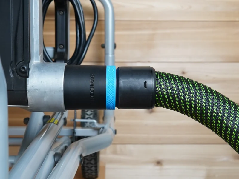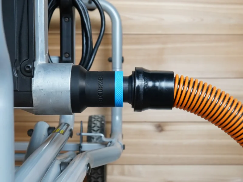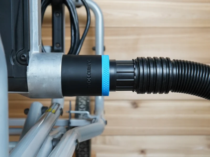 ToolCurve’s hose adapter for Kobalt table saw’s lower 2 1/4 in dust port. This adapter allows you to use your dust extractor hose with your Kobalt table saw’s 2 1/4 rear dust port.