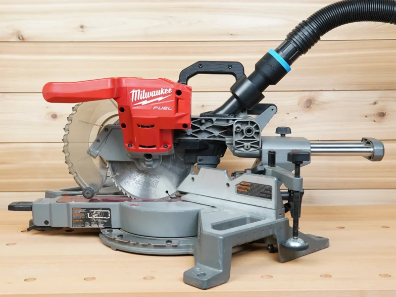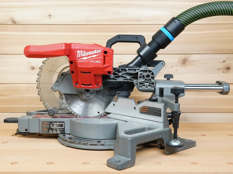 • Connect your shop vac & dust extractor hose to your Milwaukee 7-1/4″ Cordless miter saw
