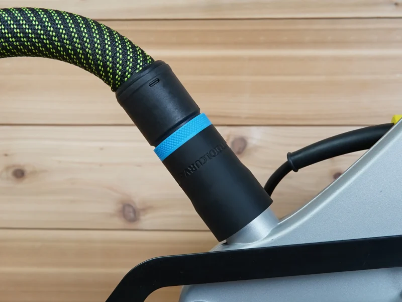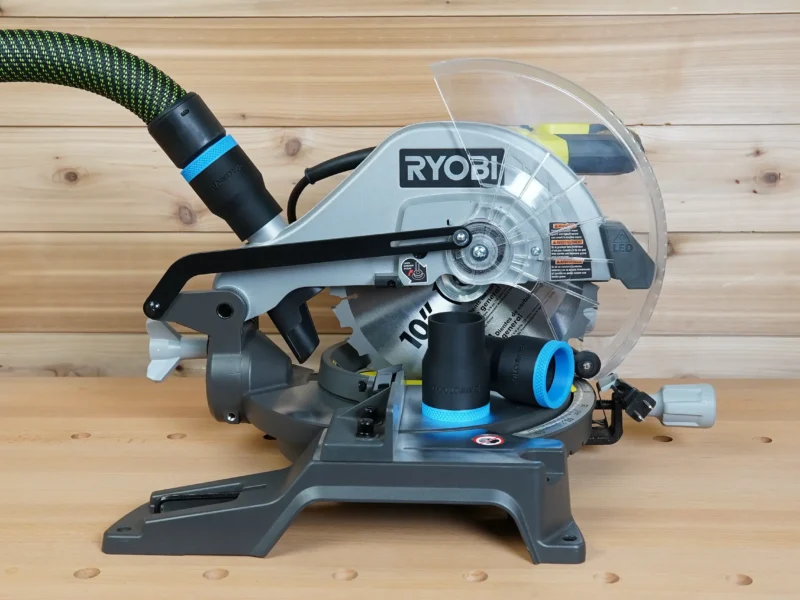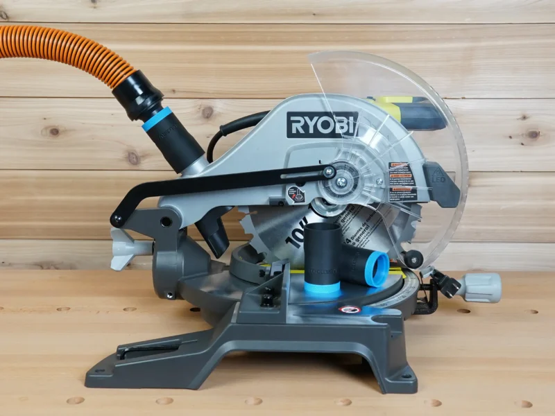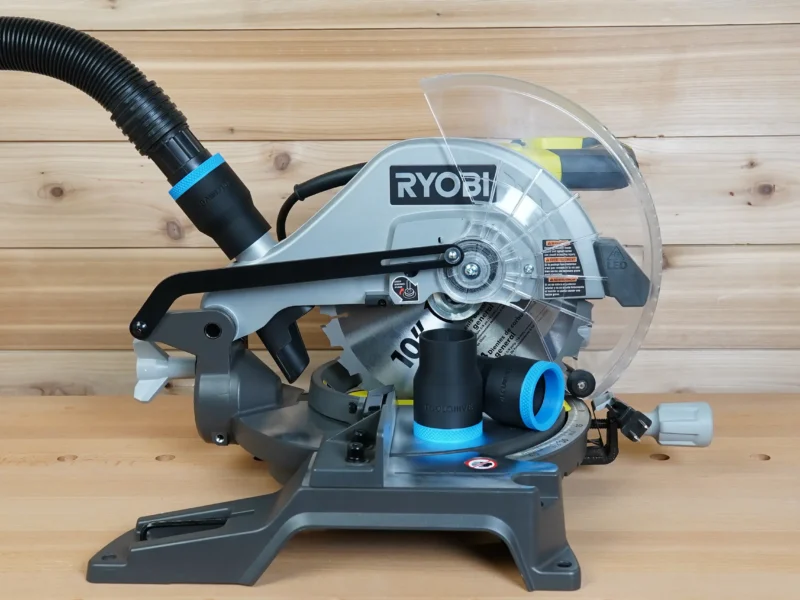 - Connect your shop vac & dust extractor hose to your Ryobi 10″ Compound Miter Saw